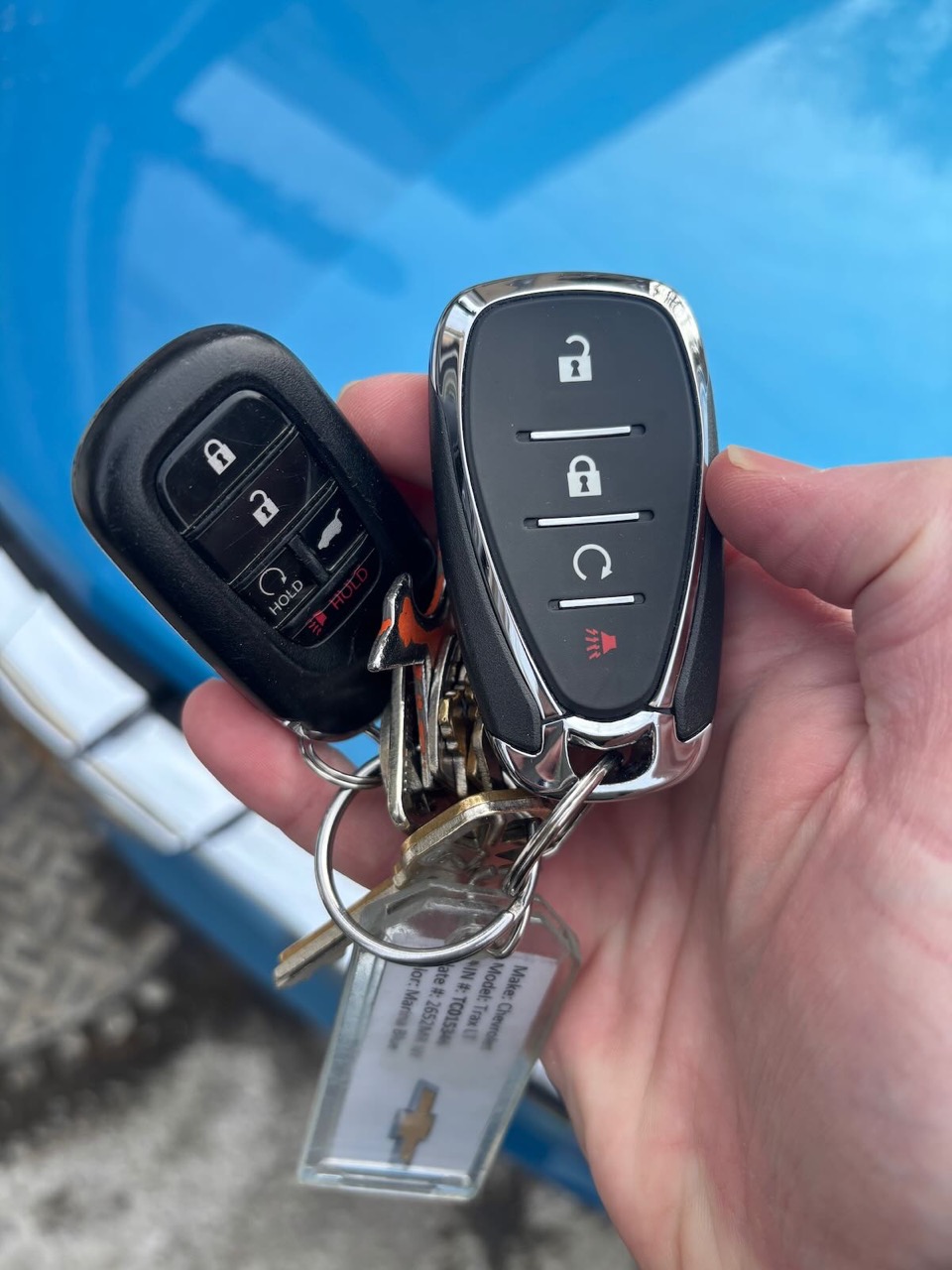 On the left are my totally average, easy-to-use Honda keys. On the right are the Chevy Trax keys. This is the keyfob equivalent of one of those cell phones for elderly people who don’t want a fancy smartphone. This is a Jitterbug-ass remote. If VTech ever sold a real car, this is what the key fob would look like. You know what? I like it. I don’t need a complex remote. I just want something that works.