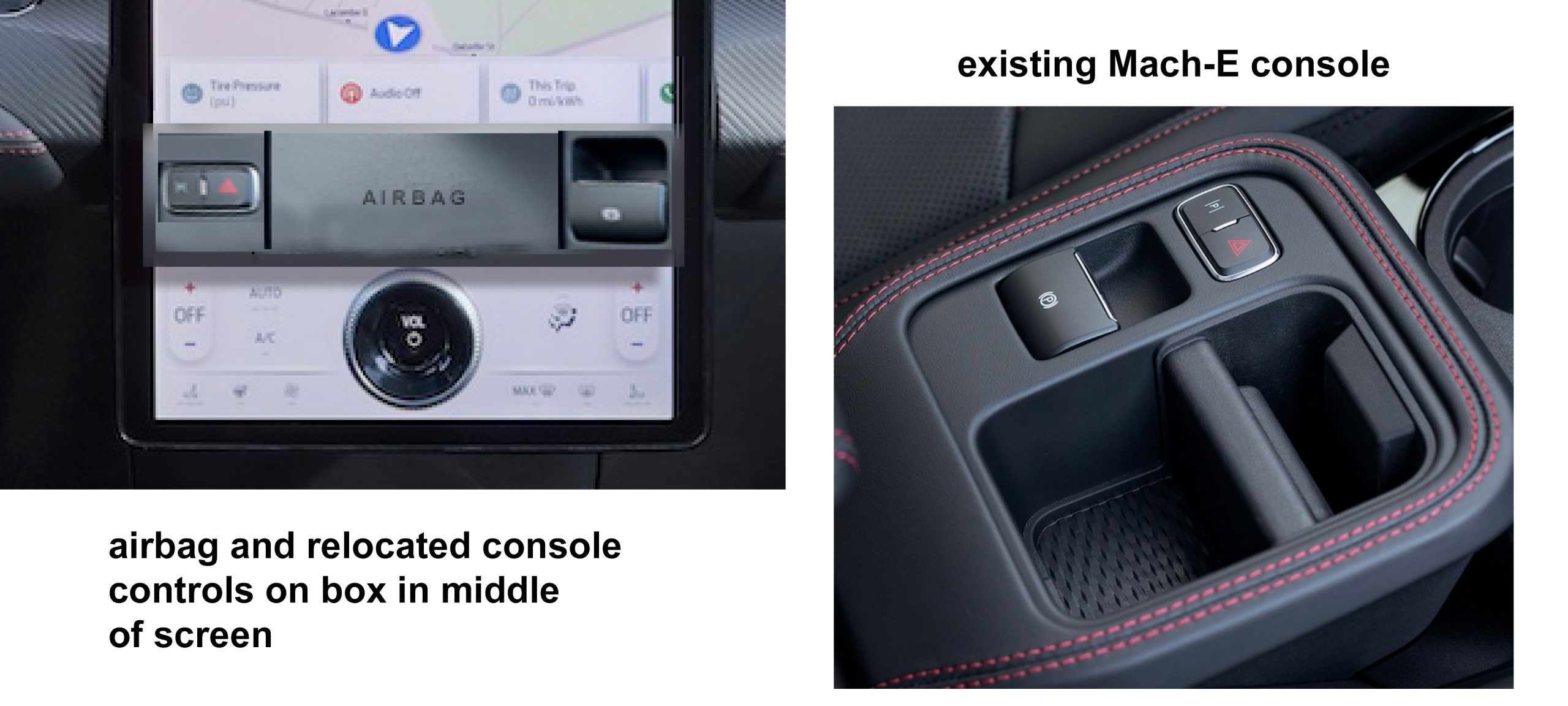 I’m not sure if an airbag is required for a center front seat passenger but if bench front seat cars got popular, I have a feeling that it might be. What I’ve done is added a surface-mounted box onto the middle of the main screen that incorporates that airbag as well as the hazard flasher and parking brake control that will be displaced from the Mach-E’s now-no-longer-existing console.