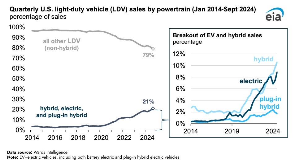 One of the numbers I’ve been looking forward to is when, on a monthly basis, the number of new electric cars sold makes up more than 10% of all new car sales. As you can see in this series of charts from the Energy Information Agency, there has been a steady climb in EVs and electric cars since 2014.