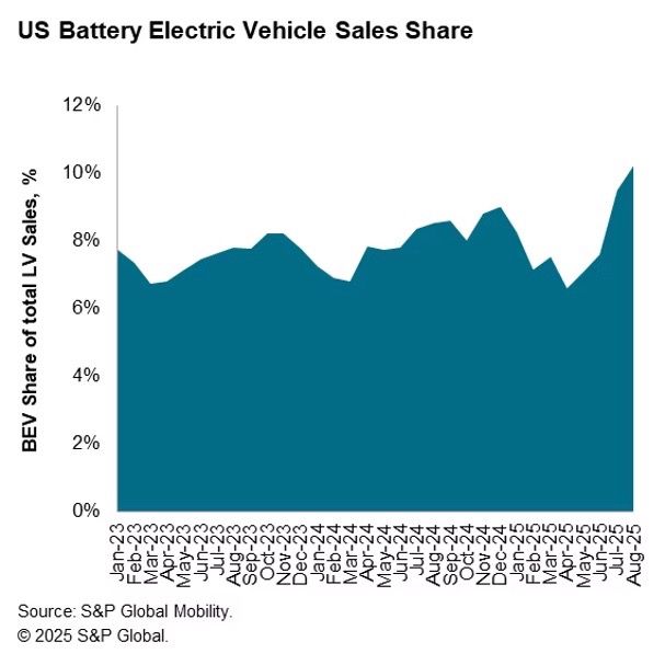 Now, it seems like the ICE/hybrid sales pulled forward by tariffs are starting to wane at the same time that automakers/consumers are trying to sell/buy EVs before the expiration of the federal tax credit at the end of September. The estimate from S&P Mobility is that, for the first time ever (I think), the combination of mid regular car sales and urgent EV sales will push that number over 10%.