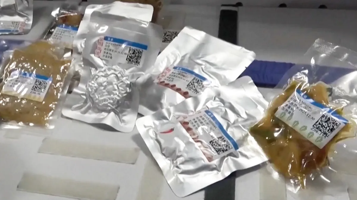 The food is significantly better looking than most space food, being real, genuine meat, on the bone in the case of the chicken. This is food intended to be eaten soon after docking, and likely is not held to the same storage and preservation standards of other space food that would be stored on the station. Most food served on Tiangong is closer to what most space food looks like, which is to say various pouches of goops and clumps: