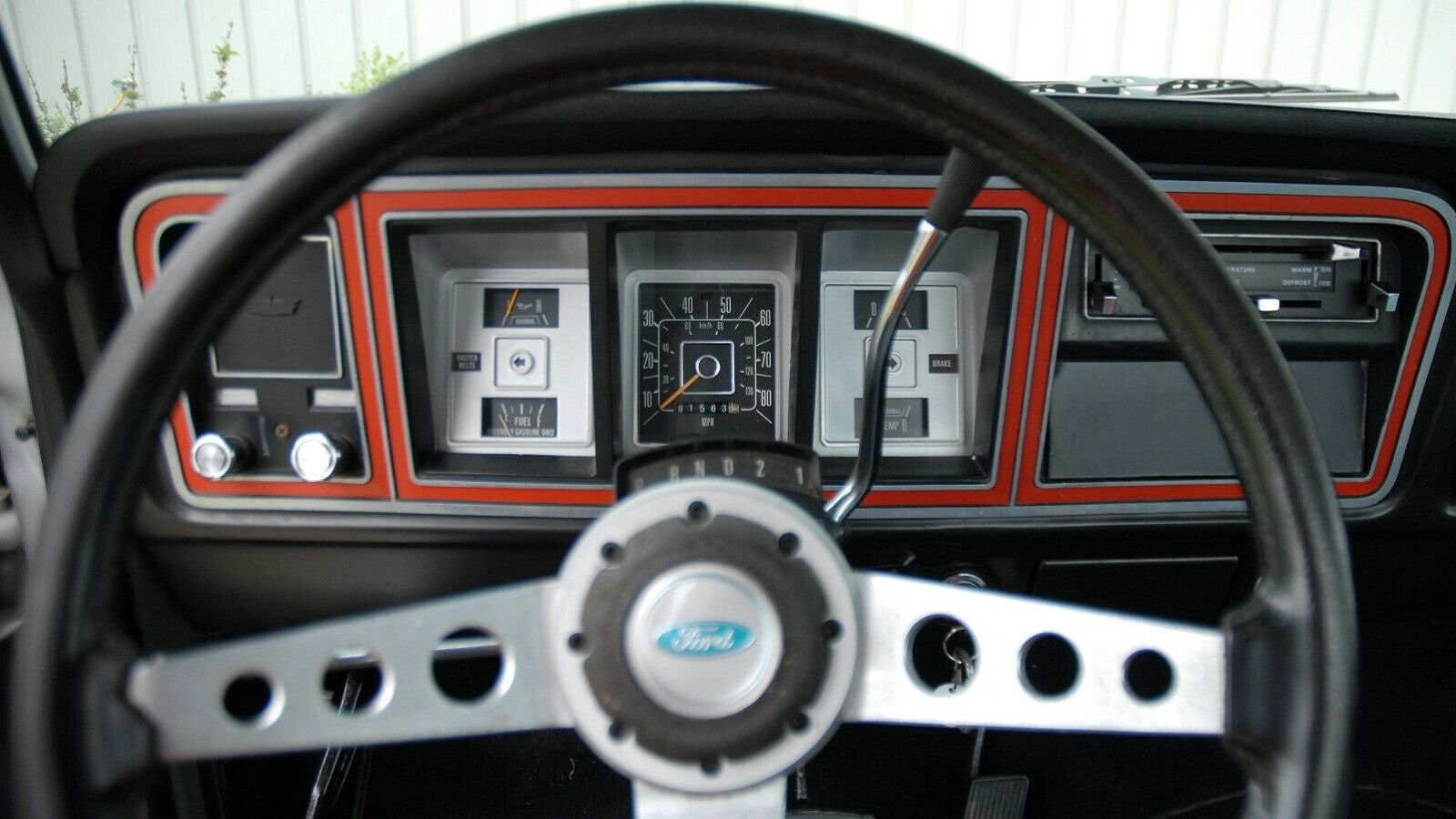 Full instrumentation, but if you wanted a tach, you’d have to grab a Stewart-Warner catalog and a steering column bracket. Note that the switch that’s usually the rear defroster on any Ford from the seventies up to the mid-eighties actually switches fuel tanks here.