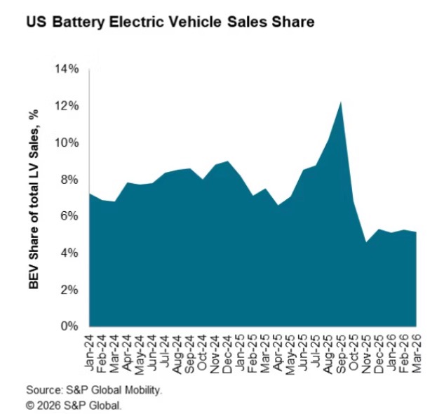 As you can see above in the chart from S&P Global Mobility, the share of EV car sales is down a lot from its peak above 12% in September, and off the pre-election climb towards 10%. Total sales for the market were down from nearly 1.6 million vehicles in March 2025 to an estimates 1.4 million this month. That is sticking with the expectation that this year’s car sales are going to be middling-to-bad given all the uncertainty. The EV market share barely stayed at 5% in March.