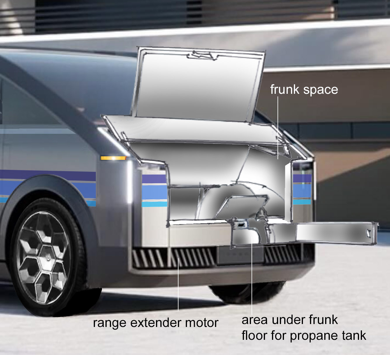 Would there be a fuel tank up front? I think you could have a gas tank, but one of the biggest issues of EREVs for some people is the introduction of a pollution-creating ICE engine to their once-zero-emissions vehicle. A possible solution might be a natural gas- or propane-powered range extender; you can’t easily find propane filling stations, but virtually any gas station will have 20-pound tanks for barbecue grills.