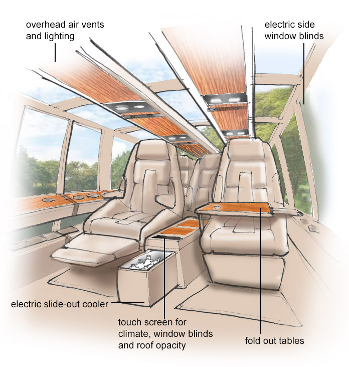 Inside, we’ll offer all of the amenities you’d expect from a conversion van, all updated for the twenty-first century. Comfortable rotating heated, cooled, and massaging chairs with flip-down armrests could also recline and include flip-up footrests. Between the center row would be a console with flip-up tables. A touchscreen on the console would operate the climate control and entertainment options, and also change the opacity of the glass roof and lower window shades. Touch another part of the screen, and a refrigerator would slide forward to allow cold-drink access.