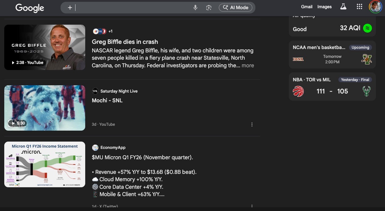 What Google did to make up for this is a product you may not even be aware of, but everyone in the industry knows as Google Discover. Basically, any time you go to any Google product, it’ll serve you up some stories, videos, or social media posts. Here’s what my search page looks like: