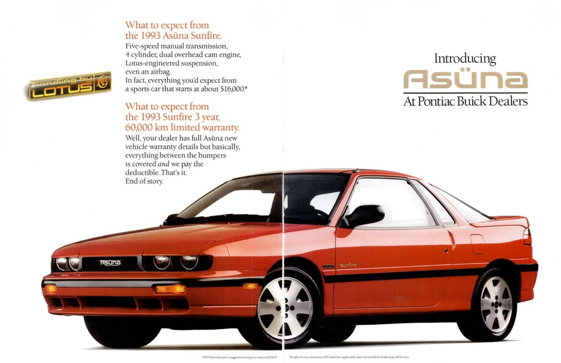 Initially, the Tracker was sold with a Chevy bowtie at Canadian Chevrolet-Oldsmobile-Cadillac dealers and as an identical product at Pontiac-Buick-GMC dealers. Suzuki- and Isuzu-branded “captive imports” had sold well at the Chevy stores, so GM decided to match the States and sell them under the Geo brand in Canada for 1992. This left the Pontiac-Buick-GMC dealers wanting their own versions of these products, leading The General to come up with the “Asuna” brand. This has to be the most phonetically contrived names ever thought up, complete with Motley Crue-style umlauts. Asuna also sold that awful Daewoo Opel and the Sunfire, which was a rebadged Geo Storm:
