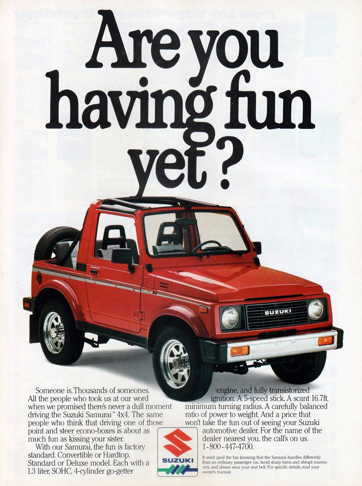 Priced at a mere $6200, it quickly outsold the Wrangler YJ, and Suzuki moved nearly twice as many Samurais as the Jeep, which was priced $2,000 more than the Suzuki.
