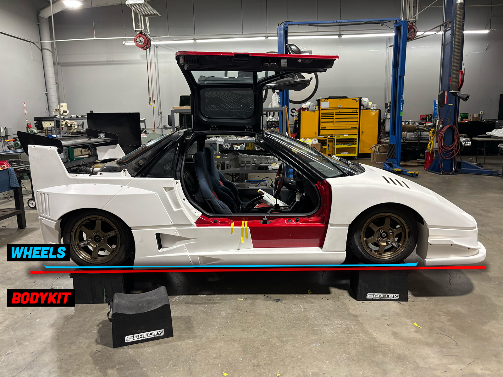 One of the technicians at GAS confirmed this wasn’t just a wheel size issue, but that they would need to install some sort of lift kit on the suspension to get this to work. They’re confident they can do it, of course, but it is a sort of hilarious problem to encounter, and not one I think I’ve seen before. I’ve definitely seen lowered cars with ground-scraping body kits, but never ones where the wheels are left essentially dangling.