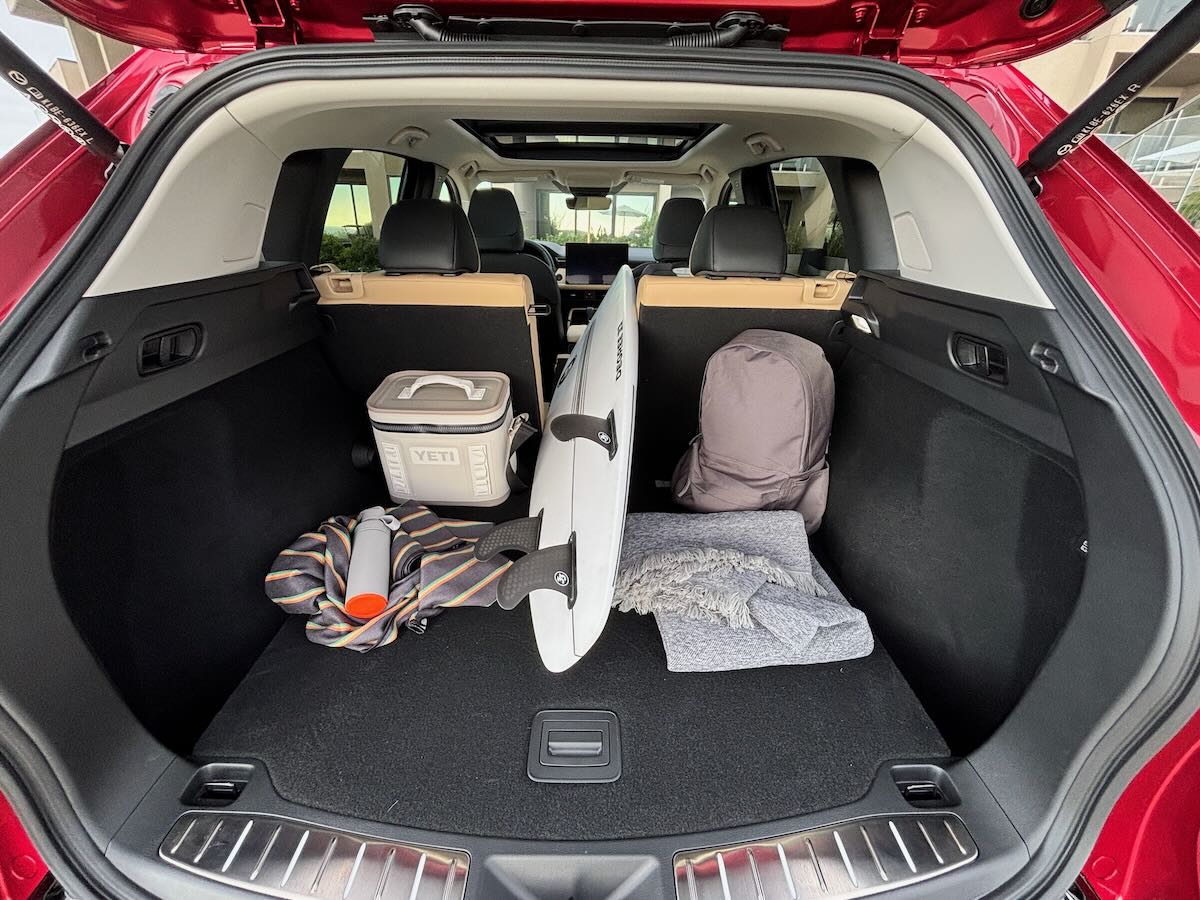 No, not a Yeti cooler and a surfboard (although…). It has a rear seat that can split down the middle or on the sides. Most vehicles in this class allow you only the 2/1 combo; the 1/1/1 here is aces. While we’re back here, the larger and taller cargo area is easier to load into with a wider opening and has a lower entry point. I’m tall, so I don’t care, but not everyone is tall.