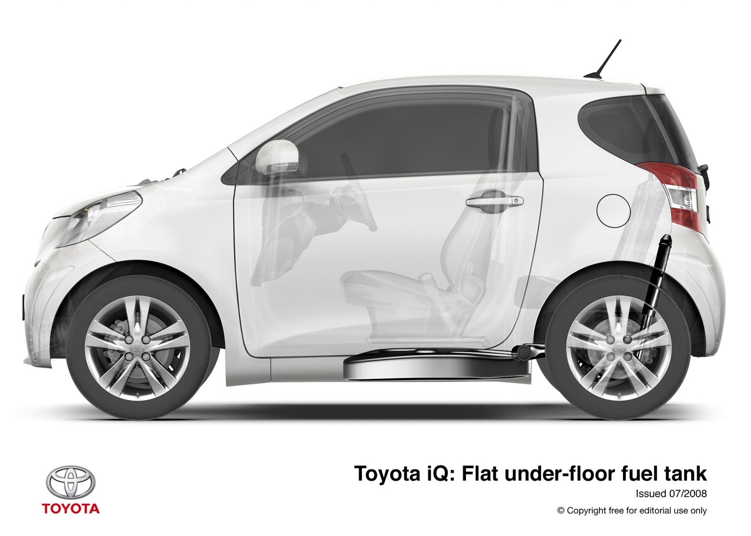Toyota used some clever engineering to make a car about 10 feet long and 5.5 feet wide fit four people. The automaker says a lot of the tricks went into the vehicle. To maximize interior volume, Toyota punched the wheels out to as far near the edges as they could be. To facilitate this up front, the differential was moved forward of the engine, placing the centerline of the wheels slightly ahead of the engine.